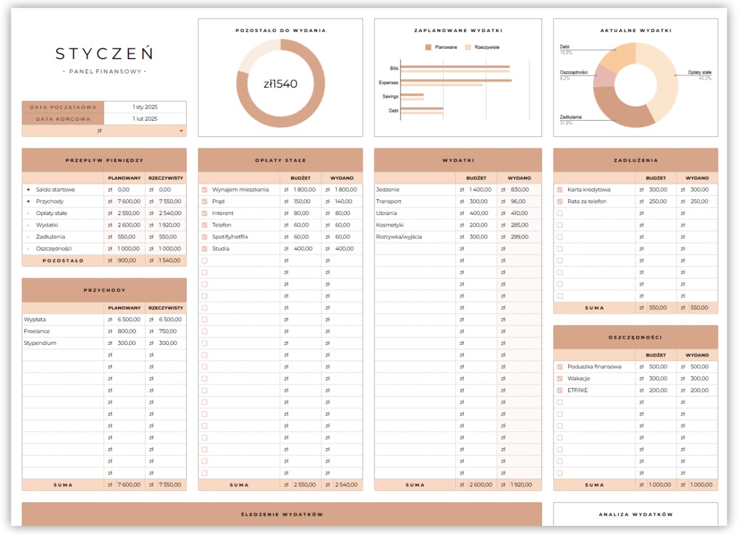 ✅ Gotowe sekcje: wpływy, wydatki, opłaty stałe, oszczędności i zobowiązania